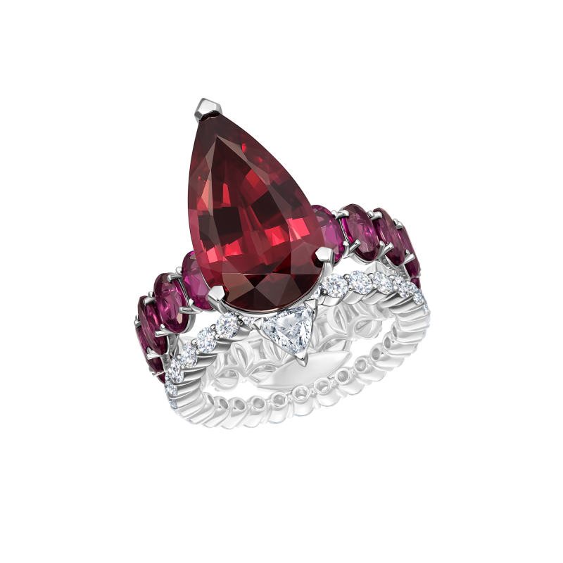 Родолиты огранки груша и овал. Бриллианты огранки триллион и круглой огранки.