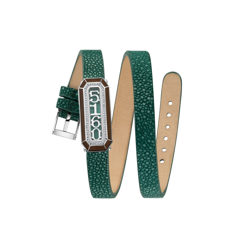 Бриллианты круглой огранки. Малахит, сапфировое стекло, эмаль и браслет из кожи ската.