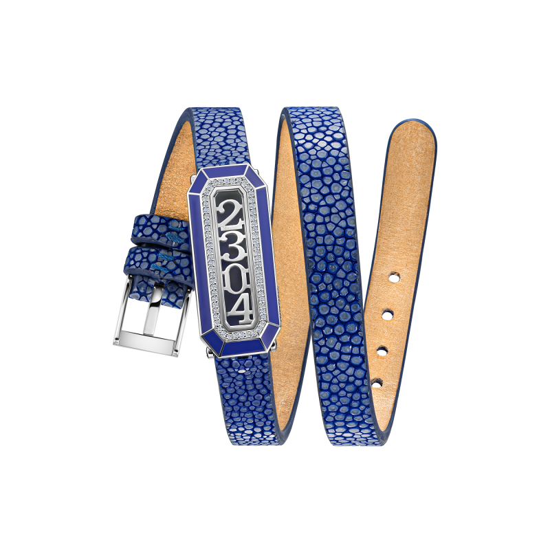 Бриллианты круглой огранки. Лазурит, сапфировое стекло, эмаль и браслет из кожи ската.