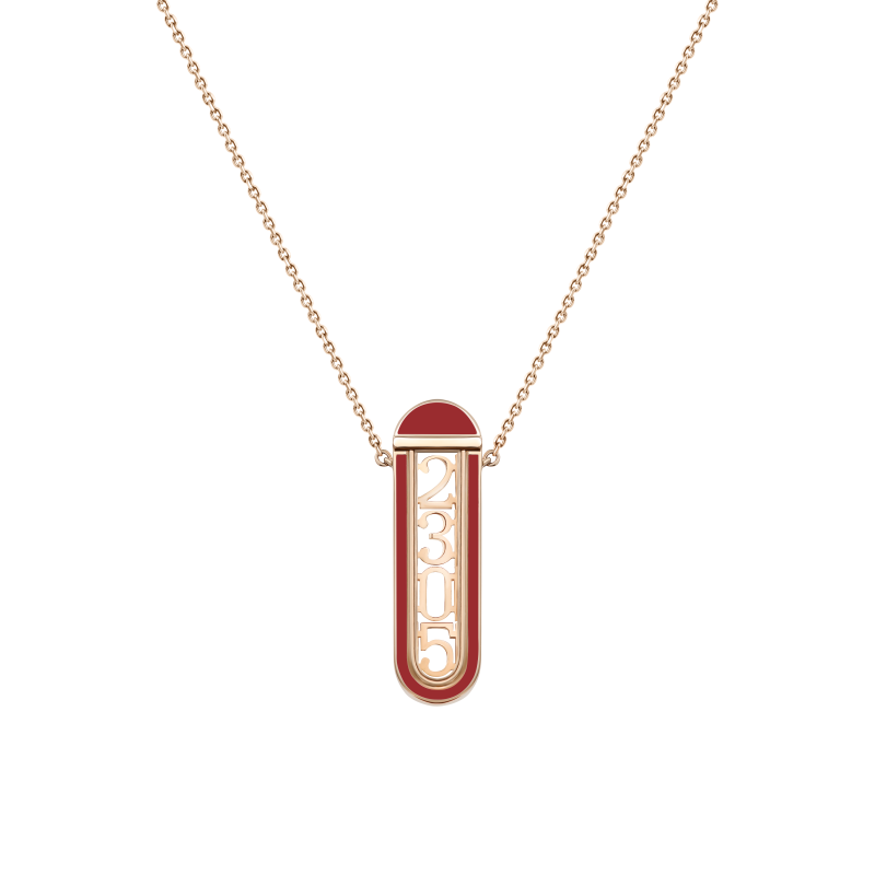 Капсула из розового золота и сапфирового стекла, обрамленная золотым ободком с цветной эмалью, прикреплена к цепочке с тремя уровнями длины. В капсулу можно одновременно поместить 4 сменные цифры из золота, которые служат символом чего-то важного и особенного. Это могут быть даты, связанные с определенными событиями или традициями вашей семьи, с обстоятельствами, изменившими течение вашей жизни. В набор входит фирменный пинцет и 10 золотых цифр от 0 до 9, которые самостоятельно можно легко менять в капсуле.