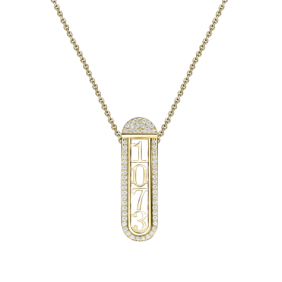 Капсула из желтого золота и сапфирового стекла, украшенная россыпью сияющих бриллиантов, закреплена на цепочке с тремя уровнями длины. В капсулу можно одновременно поместить 4 золотые сменные цифры, которые символизируют для вас нечто важное – даты или события, имеющие особое значение или сакральный смысл.