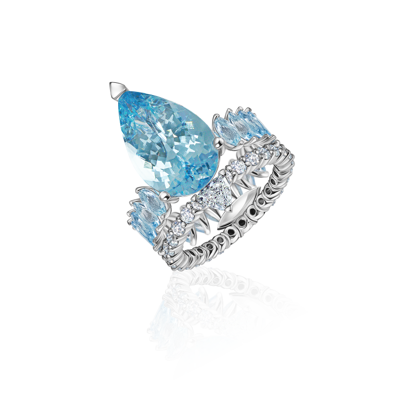 Аквамарины огранки груша и маркиз. Бриллианты огранки триллион и круглой огранки.