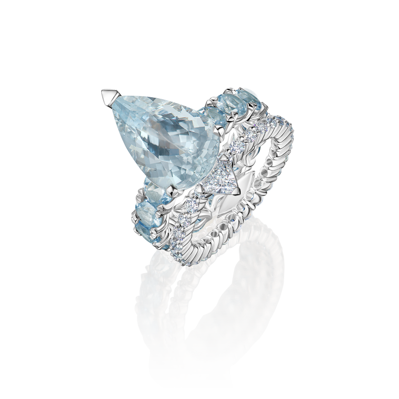 Аквамарины огранки груша и круглой огранки. Бриллианты огранки триллион и круглой огранки.