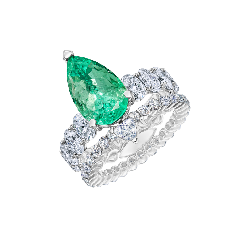 Изумруд огранки груша. Бриллианты огранки овал, триллион и круглой огранки.