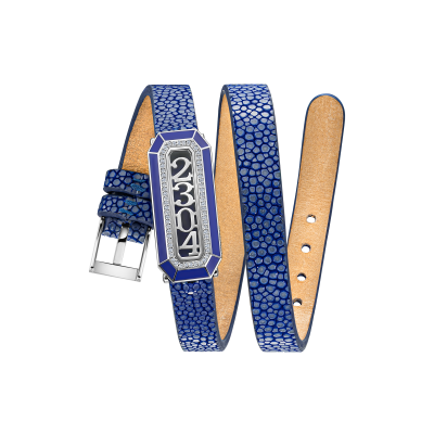 Бриллианты круглой огранки. Лазурит, сапфировое стекло, эмаль и браслет из кожи ската.