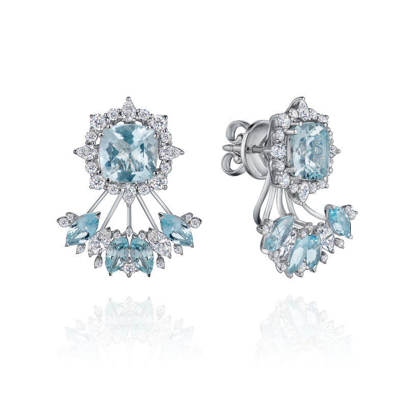 Аквамарины огранки антик и маркиз. Бриллианты огранки груша, маркиз и круглой огранки.