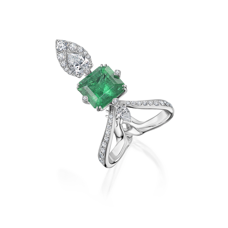 Изумруд изумрудной огранки. Бриллианты огранки груша и круглой огранки.