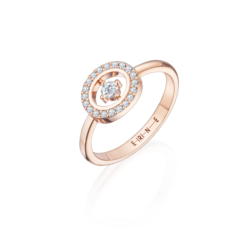 Классическое кольцо из розового золота. В центре – великолепный парящий бриллиант в обрамлении мерцающей россыпи бриллиантов. Кольцо прекрасно дополнят серьги-пусеты и колье с бриллиантом в той же стилистике.